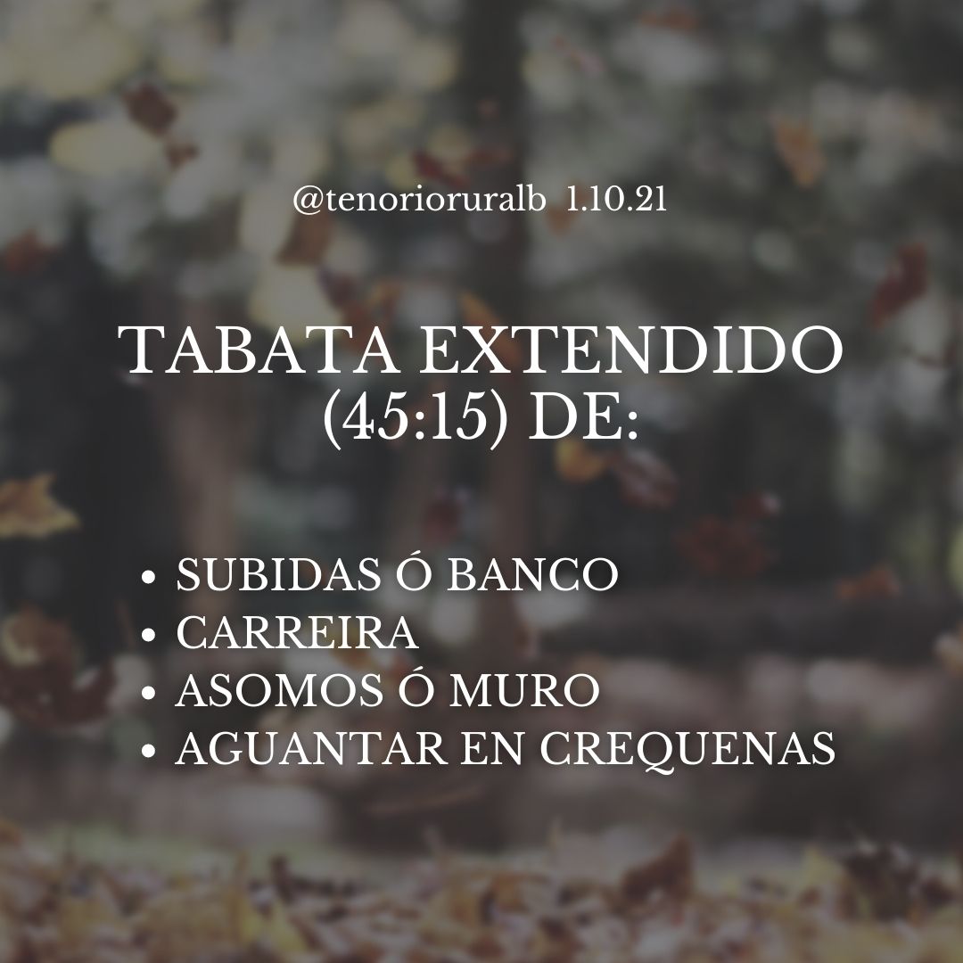 WOD TRB do 1 de outubro de 2021 Publicado porTenorio Rural Bootcamp01 de outubro de 202102 de outubro de 2021Publicado enWOD WOD TRB 01.10.2021Tabata extendido (45:15) de:Subidas ó bancoCarreiraAsomos ó muro altoAguantar en crequenas Compartir: Share on Facebook (Se abre en una ventana nueva) Facebook Share on X (Se abre en una ventana nueva) X